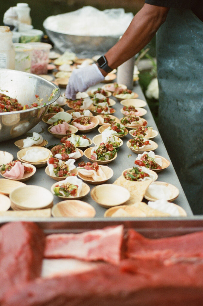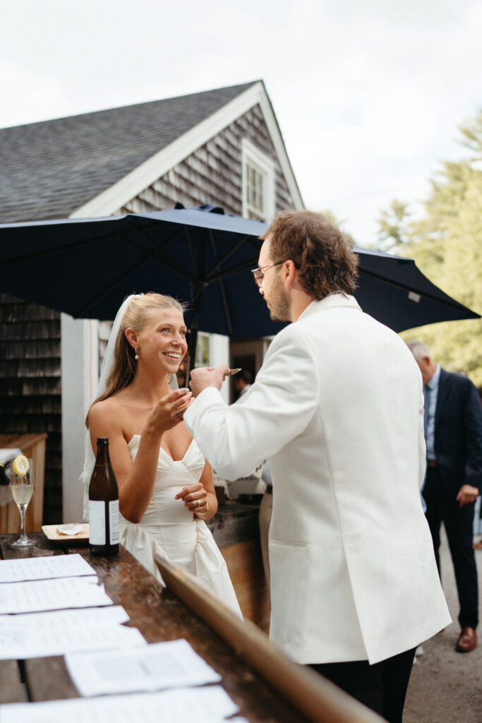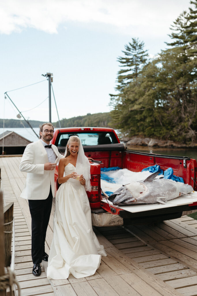 Emma and Josh’s September wedding at Glidden Point Oyster Farm had it all: fresh-caught tuna cut up right in front of them, a rainstorm that soaked that same tuna, and steady sunshine that brought out a small rainbow over the water. It was classic Maine in the best way.
