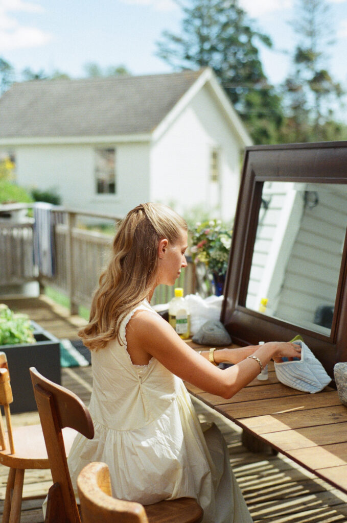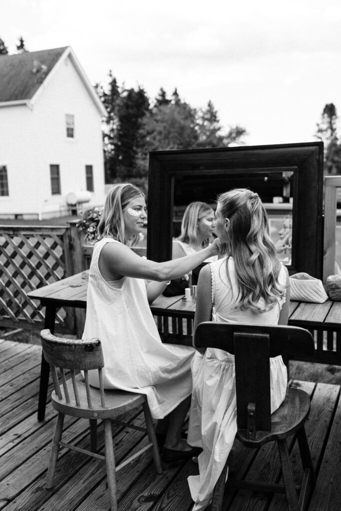 Emma got ready at a charming Airbnb nearby that felt very Maine coast. It smelled like the ocean and had the warmth of a classic summer home. She and her sister set up mirrors outside to use the natural light, and her sister did her makeup. The whole morning felt calm and unhurried.